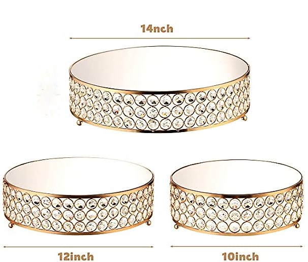 Crystal beads Cake stand, use this round crystal cake stands to complement your cake, treats or pastries at your next event, each cake display is fitted with a mirror display. Designed with mixed metal wire rings and crystal beads, the framework really allows them sparkle and shine while the hollow body allows for additional lighting opportunities to really make your display be the talk of the table. This Set of three-piece cake stand is the best opportunity for any occasion.