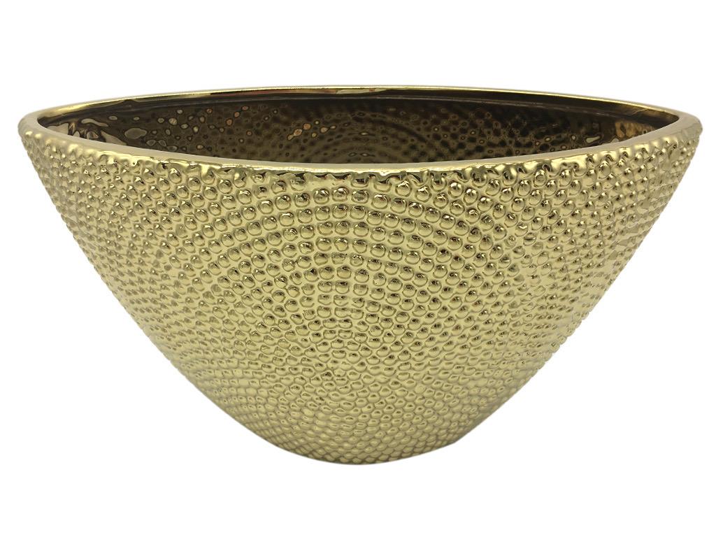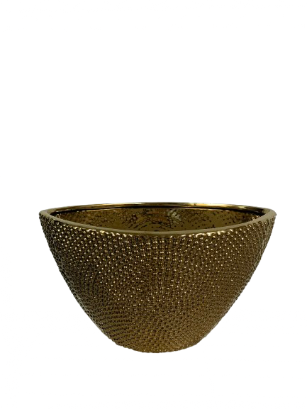 The Midnight Noir Textured Ceramic Pot can add a touch of luxury to your decor with this textured metallic gold decorative pot. Crafted from high-quality ceramic, this bowl features a dimpled or hammered texture that radiates in concentric circles, creating an eye-catching visual effect. Its sleek, rounded conical shape with a wide-open top and narrow base add elegance and sophistication to any space.